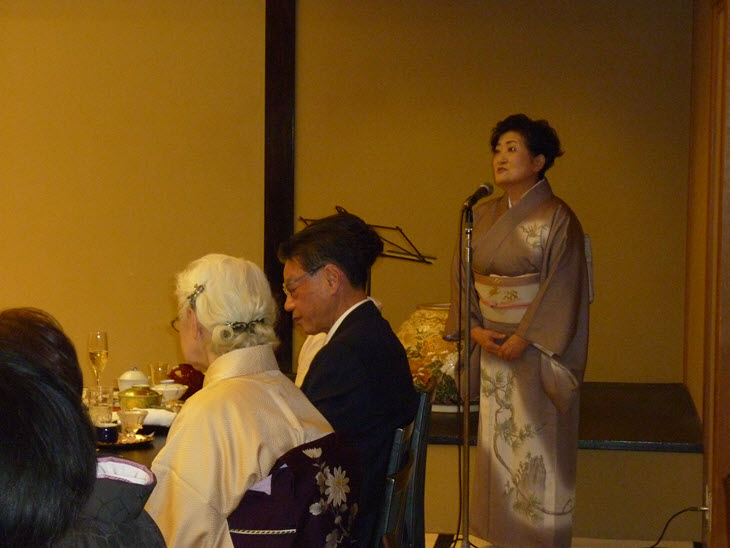午後からは、和室宴会場「錦水」にある大広間「八千代」の間にて披露宴が開かれ、初めに如水流代表で新家元の父である青池栄の挨拶の後、女子栄養大学の香川芳子学長の祝辞メッセージの紹介がありました。如水流は初代家元宗照の頃より同学長と親交が深く大学茶道部の講師を担っております。