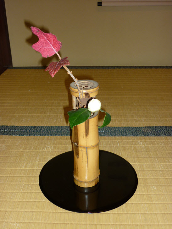 床に初代家元片山宗照筆の和歌小色紙を掛け、松平不昧在判の竹一重切花入には白玉椿と照葉を施しました。