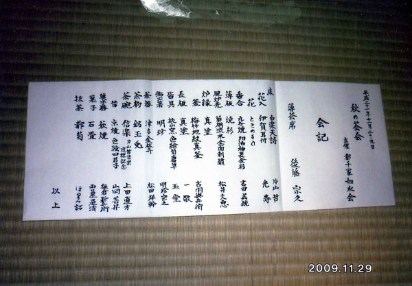 秋の茶会は都千家如水流の親睦を目的としたいわば内輪の茶会です。初代会長片山宗照の父片山哲縁の品々を用いて席を設けました。写真には有りませんが、お茶碗は片山哲先生が信楽を遊説された記念に箱書きのある上田直方作の茶碗を使いました。