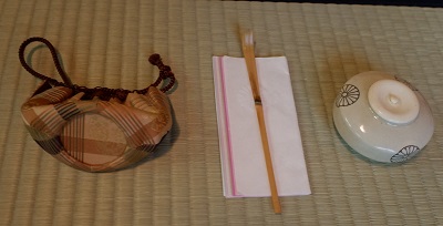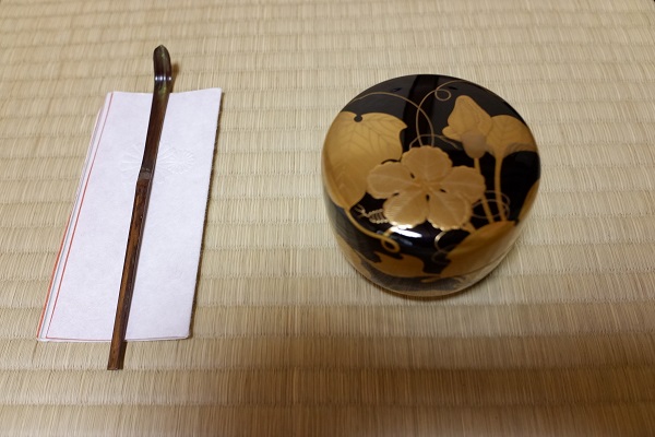 茶入:京焼 菊紋、茶杓:発巳 初夏 小堀宗明 仕覆:和久田金欄木瓜型紋